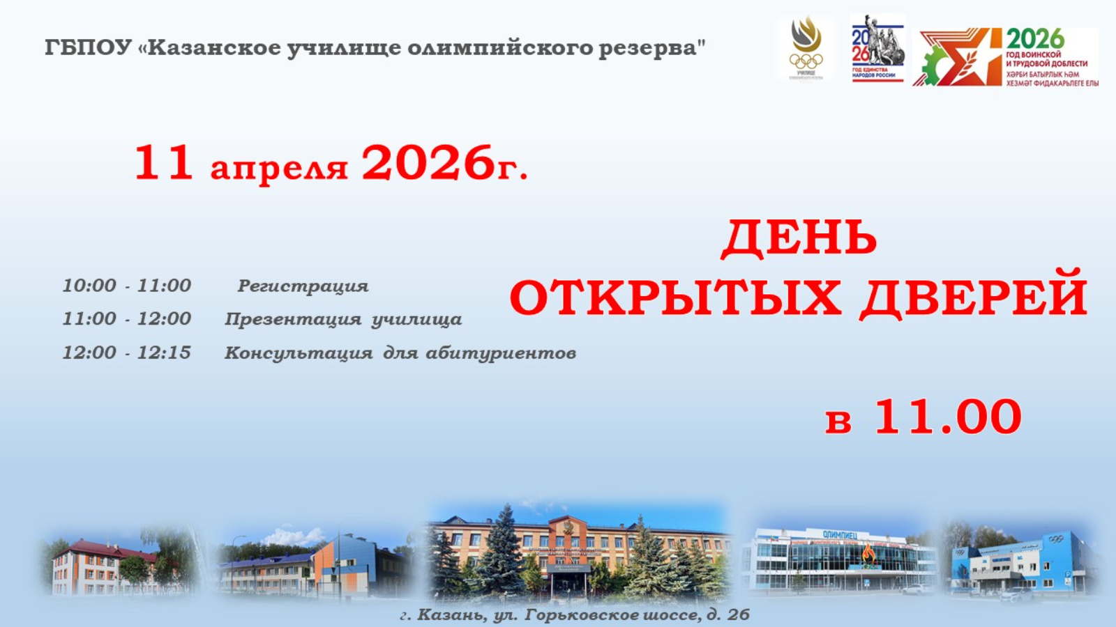 г. Казань, ул. Горьковское шоссе, д. 26 Приглашаем на день открытых дверей в ГБПОУ «Казанское училище олимпийского резерва»!
