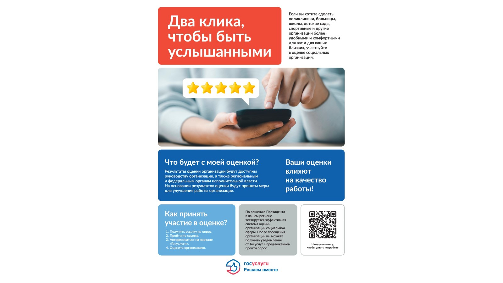В России проходит эксперимент по внедрению эффективной системы оценки услуг организаций социальной сферы. Она разработана Минтрудом России и Минцифры России при методической поддержке Агентства стратегических инициатив (АСИ) во исполнение решения Президента России. Эта система позволит получить обратную связь об организации социальной сферы и выяснить удовлетворенность граждан качеством дошкольного и школьного образования и медицинской помощи, проведения медико-социальной экспертизы, а также работы организаций физкультуры и спорта.